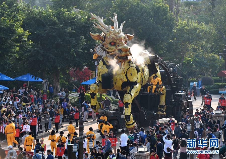 1月18日,大型機械裝置藝術品“龍馬精神”在珠海長隆海洋王國巡游展示。
