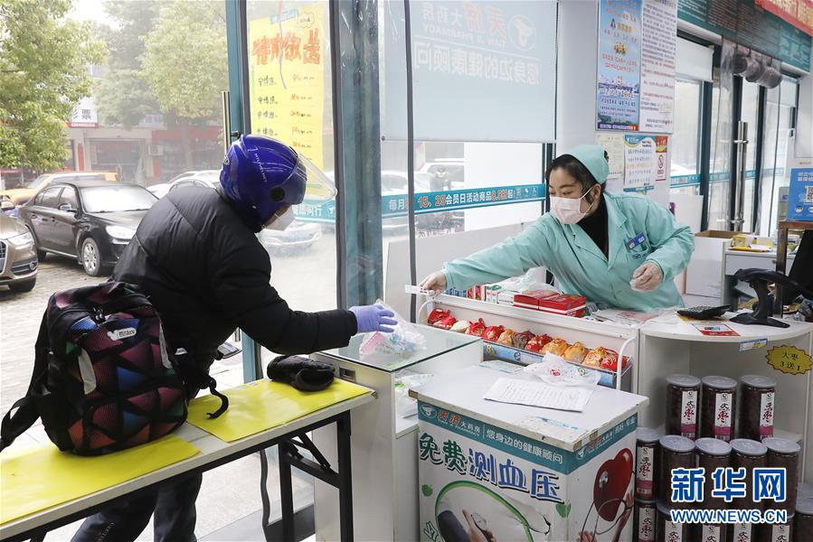 2月22日,王春波將藥品遞給前來買藥的外賣騎手。王春波是武昌天濟大藥房錦繡江南店的一名店員,在武漢下達“所有小區(qū)全面實施封閉管理”的禁令之后,很多居民買藥成了麻煩事,尤其是獨居的老年人。她知道后,主動聯(lián)系物業(yè)告知大家,如果有需要,她可以上門送藥?,F(xiàn)在,她和同事每天要派送100多單藥品,大部分都是“三高人群”服用的藥。很多顧客很感激王春波,“幸虧你們一直開業(yè),東西也齊全,一分錢都沒漲!”王春波說:“關鍵時期,大家都是在相互幫忙,這就是很平常、很普通的一件事?!毙氯A社記者熊琦攝