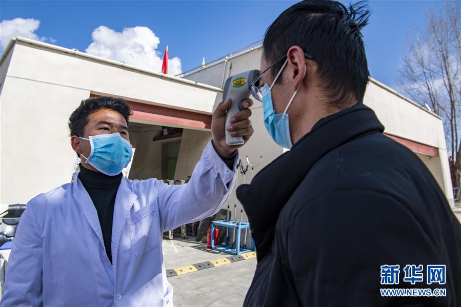 西藏大學(xué)醫(yī)學(xué)院預(yù)防專業(yè)本科生次成郎加(左)在學(xué)校門(mén)口為來(lái)校者測(cè)量體溫(2月23日攝)。新華社記者孫非攝
