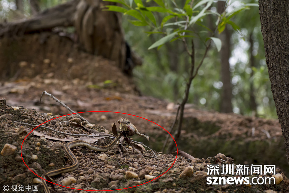 印度加爾各答B(yǎng)olpar,業(yè)余攝影師Agniswar Ghosal在Bolpar散步時(shí)拍到蛇大口吞咽蟾蜍的震撼場(chǎng)景。一條細(xì)長(zhǎng)的蛇正試圖整個(gè)吞下一只大蟾蜍,蟾蜍的頭已經(jīng)進(jìn)了蛇口,大半截身體還在外邊。這條野心勃勃的蛇把這只毫無(wú)戒心的蟾蜍從洞里拖了出來(lái),然后溜進(jìn)灌木叢,安靜地享用晚餐。