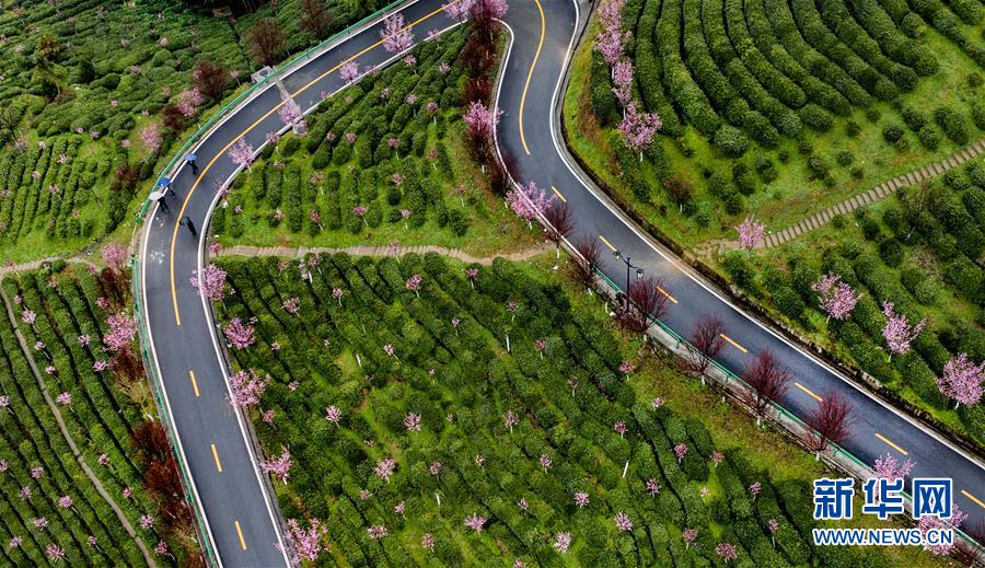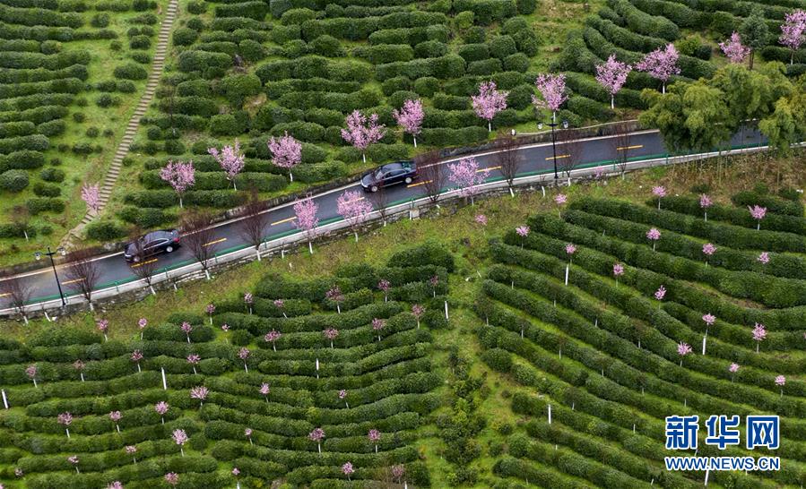 這是3月2日拍攝的平利縣長(zhǎng)安鎮(zhèn)洪福茶山,道路兩旁的春梅盛開(kāi)(無(wú)人機(jī)照片)。新華社記者陶明攝