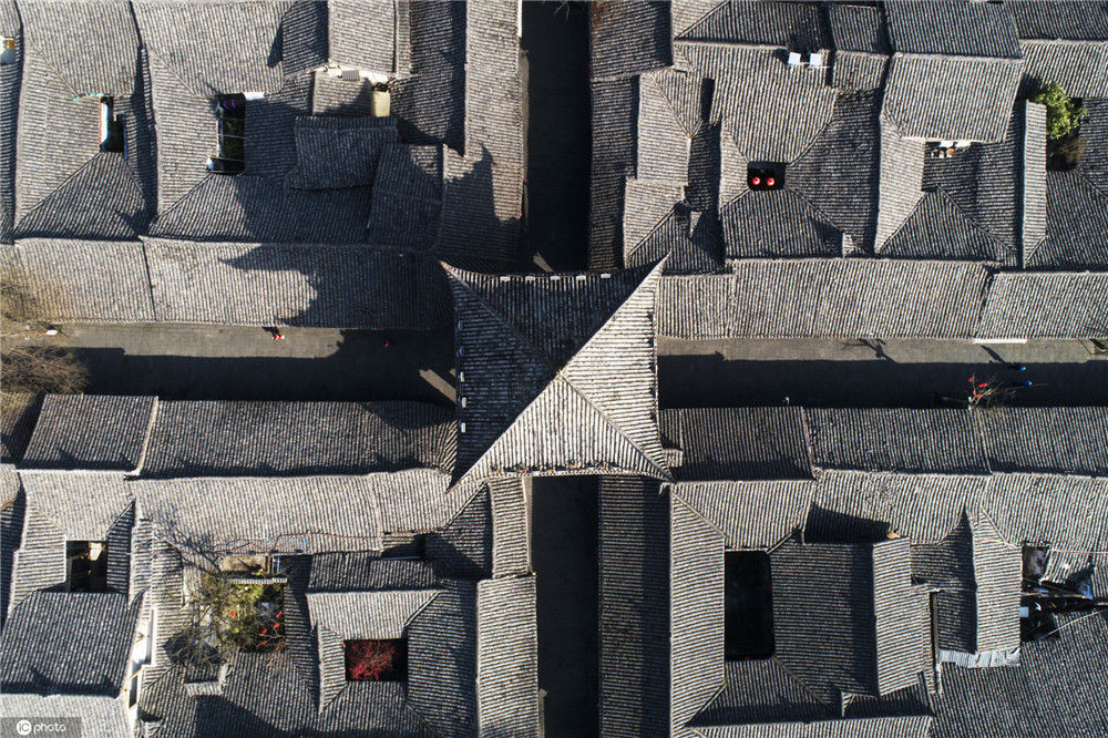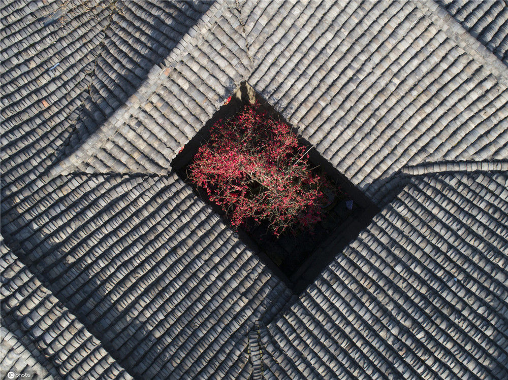 2020年2月21日,四川南充閬中古城中天樓旁,張家小院天井中的海棠在陽(yáng)光中綻放(無(wú)人機(jī)拍攝)。
