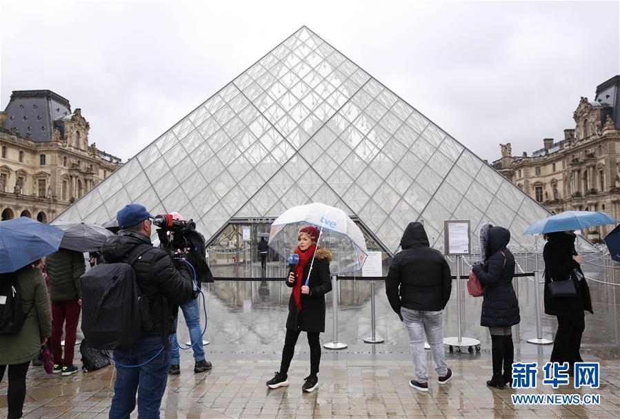 3月2日,在法國(guó)巴黎,記者在盧浮宮博物館外工作。