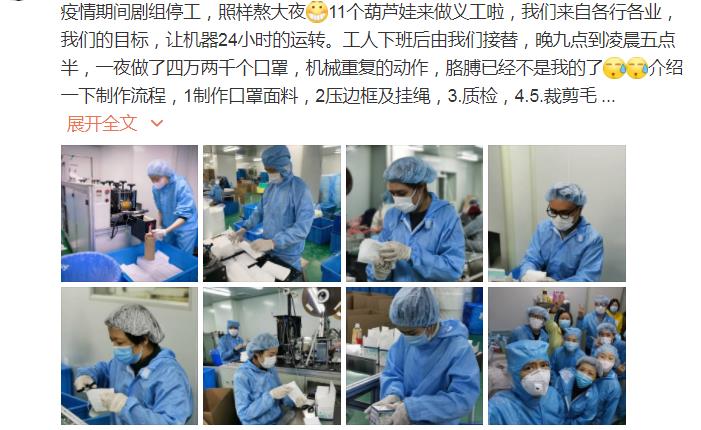 微博上,高鑫寫道:“疫情期間劇組停工,照樣熬大夜。11個葫蘆娃來做義工啦,我們的目標(biāo),讓機(jī)器24小時運(yùn)轉(zhuǎn)。工人下班后由我們接替,晚九點(diǎn)到凌晨五點(diǎn)半,一夜做了42000個口罩,機(jī)械重復(fù)的動作,胳膊已經(jīng)不是我的了。”微博上他還介紹了做口罩的流程,圖文并茂,十分“走心”。