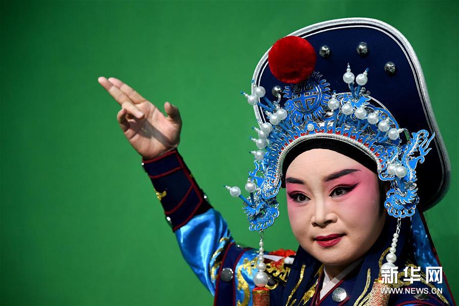 3月3日,李金玲在鄭州文化館通過直播的形式進(jìn)行帶妝表演豫劇《花木蘭》選段。新華社記者 李安 攝
