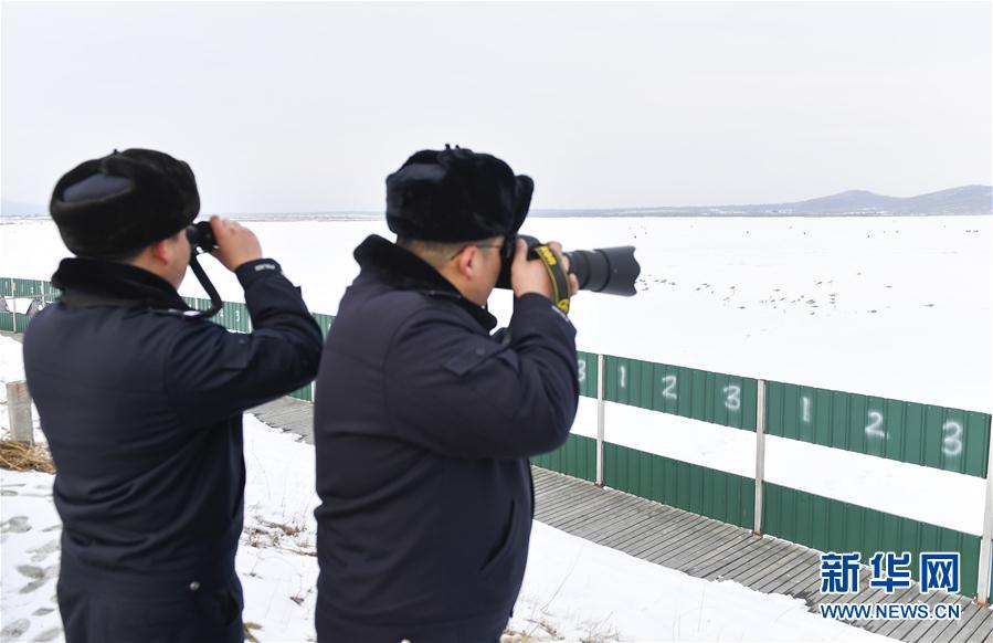 為保障候鳥在敬信濕地逗留期間的安全,琿春森林公安局基層民警奮戰(zhàn)在護鳥一線,積極加大巡護力度,在風雪天氣為候鳥投放糧食,嚴打獵捕候鳥違法犯罪,確保候鳥遷徙通道安全。新華社記者 許暢 攝