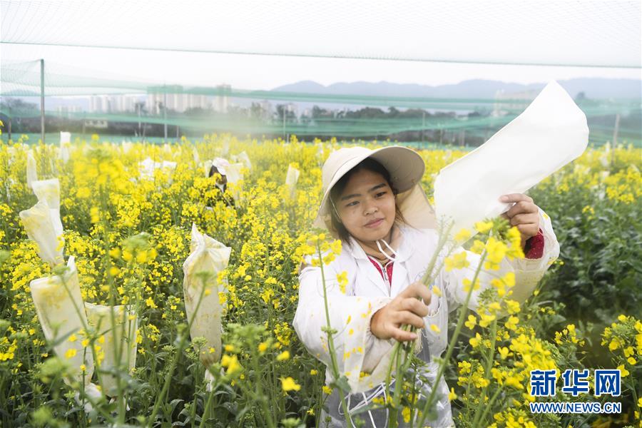 3月5日,工人在重慶市油菜工程技術(shù)研究中心油菜試驗田內(nèi)給油菜花套袋。時下正值油菜花期,重慶市油菜工程技術(shù)研究中心的農(nóng)學(xué)專家?guī)ьI(lǐng)學(xué)生和技術(shù)工人搶抓農(nóng)時,推進油菜科研和育種工作。新華社記者 王全超 攝