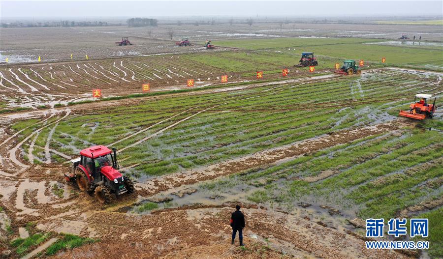 江西省南昌市南昌縣蔣巷鎮(zhèn)農民駕駛拖拉機進行春耕翻地作業(yè)(無人機照片,2月28日攝)。新華社記者 彭昭之 攝