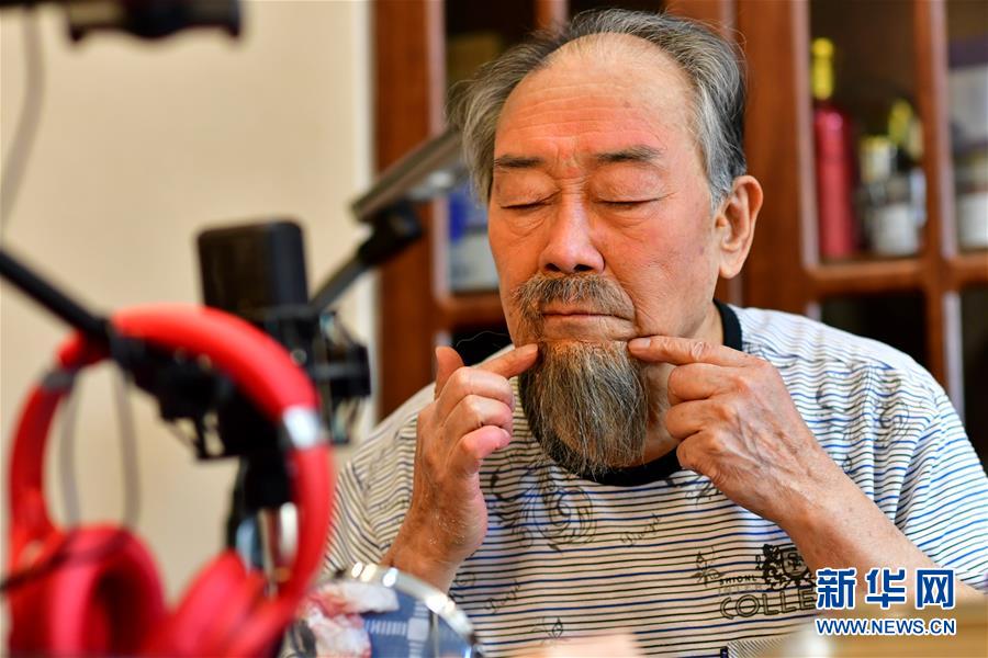 武忠在直播中為戲迷示范如何化妝(3月6日攝)。 新華社記者 曹陽 攝