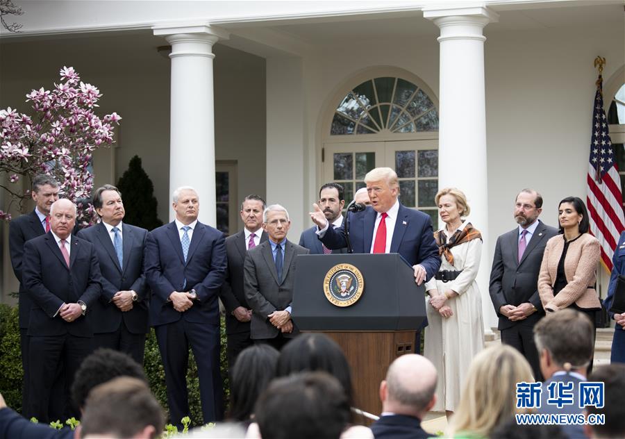 3月13日,美國總統(tǒng)特朗普(中)在華盛頓白宮的記者會上講話。特朗普當天下午在白宮發(fā)表講話時正式宣布“國家緊急狀態(tài)”。他說,此舉旨在讓美國聯(lián)邦政府全力投入到抗擊新冠肺炎疫情的努力中。這項舉措將釋放500億美元資金,幫助各州和地方政府應對疫情。新華社記者劉杰攝