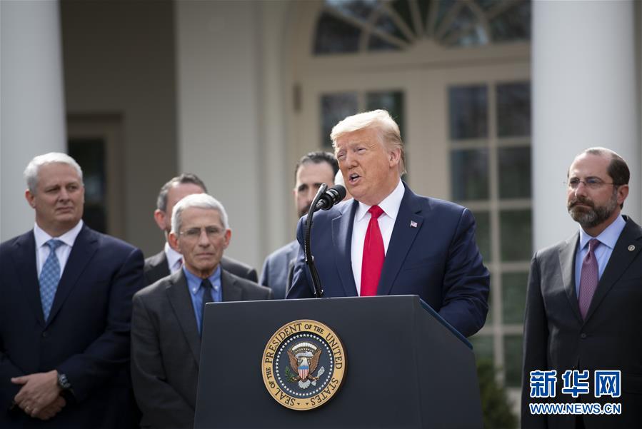 3月13日,美國總統(tǒng)特朗普(前)在華盛頓白宮的記者會上講話。特朗普當天下午在白宮發(fā)表講話時正式宣布“國家緊急狀態(tài)”。他說,此舉旨在讓美國聯(lián)邦政府全力投入到抗擊新冠肺炎疫情的努力中。這項舉措將釋放500億美元資金,幫助各州和地方政府應對疫情。新華社記者劉杰攝