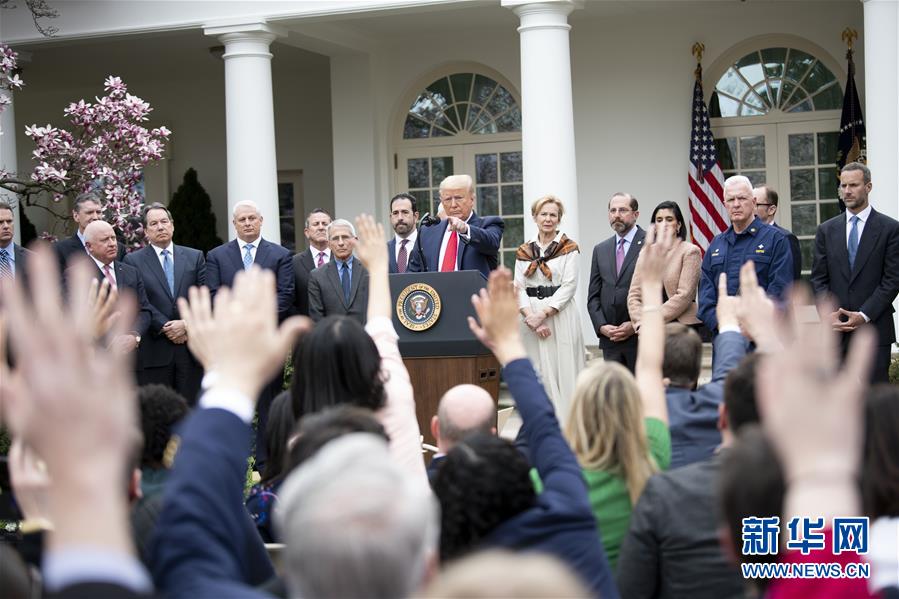3月13日,美國總統(tǒng)特朗普(中)在華盛頓白宮的記者會上講話。特朗普當天下午在白宮發(fā)表講話時正式宣布“國家緊急狀態(tài)”。他說,此舉旨在讓美國聯(lián)邦政府全力投入到抗擊新冠肺炎疫情的努力中。這項舉措將釋放500億美元資金,幫助各州和地方政府應對疫情。新華社記者劉杰攝