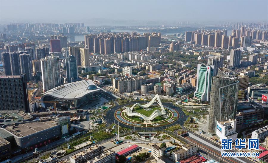 這是3月15日拍攝的武漢光谷廣場及周邊樓房(無人機照片)。 3月15日,江城武漢天氣晴好,整個城市沐浴在和煦的春光中。 新華社記者 李賀 攝