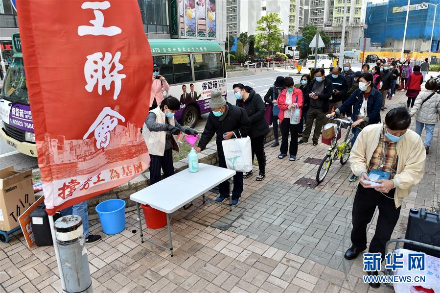 2月23日,市民排隊領(lǐng)取消毒清潔劑。當(dāng)日,香港工聯(lián)會在將軍澳向市民免費派發(fā)消毒清潔劑。新華社記者盧炳輝攝