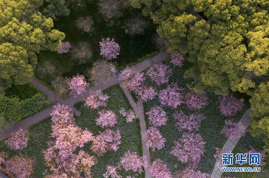 這是3月14日拍攝的武漢東湖磨山櫻園景色(無人機照片)。近日氣溫漸升,武漢東湖磨山櫻園里的櫻花漸次盛開,帶來春天的氣息。新華社記者熊琦攝