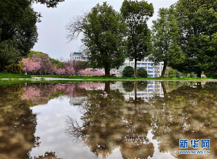 近日,隨著氣溫上升,武漢大學圖書館附近一片櫻花開放。新華社記者費茂華攝