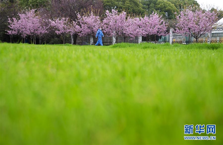 3月3日,一名工作人員從盛開的櫻花樹下走過(guò)。新華社記者費(fèi)茂華攝