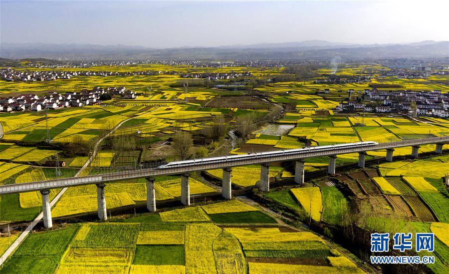 3月14日,一列動(dòng)車從洋縣油菜花海中駛過(無人機(jī)照片)。近日,秦嶺南麓的陜西省漢中市洋縣14萬畝油菜花競相開放,美景如畫。新華社記者陶明攝