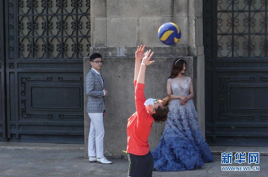 3月15日,在南京東郊體育公園,一對新人在一名練習(xí)排球的市民旁拍攝婚紗照。 當日,南京風和日麗,市民們來到東郊體育公園,踏青春游。 新華社記者 楊磊 攝