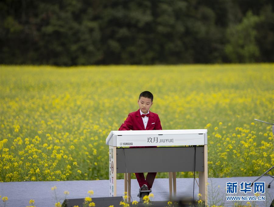 3月16日,一名小演員在李坑村的“花田音樂(lè)會(huì)”上演奏。 當(dāng)日,一場(chǎng)別開生面的“花田音樂(lè)會(huì)”在江西省婺源縣秋口鎮(zhèn)李坑村的油菜花海中舉行,帶給游人新鮮的視聽(tīng)感受。 新華社記者 張浩波 攝