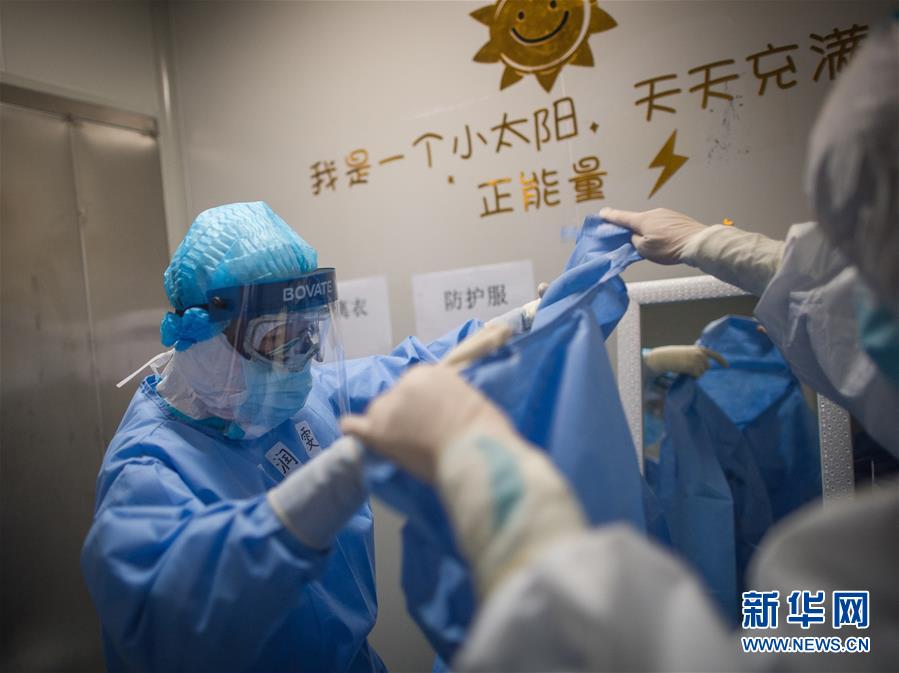 3月19日,在武漢市肺科醫(yī)院清潔區(qū),浙江醫(yī)療隊隊員孫麗秋(中)在穿戴防護服。 新華社記者 肖藝九 攝