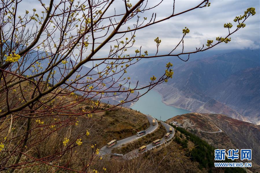 搬家的車隊(duì)行駛在金沙江畔的盤山公路上,江對(duì)岸是四川省金陽(yáng)縣(3月15日攝)。 新華社記者 江文耀 攝
