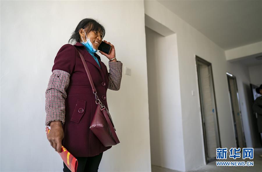 第一次進(jìn)到新家的王大香給親戚們打電話報(bào)喜(3月15日攝)。 新華社記者 江文耀 攝