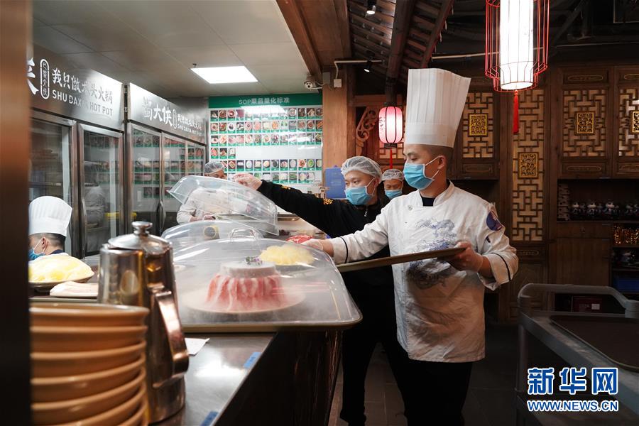 3月21日,在四川省成都市的一家火鍋店,工作人員準(zhǔn)備上菜。近日,在做好新冠肺炎疫情防控措施的基礎(chǔ)上,四川省成都市的火鍋店逐漸恢復(fù)營(yíng)業(yè)。新華社記者李夢(mèng)馨攝