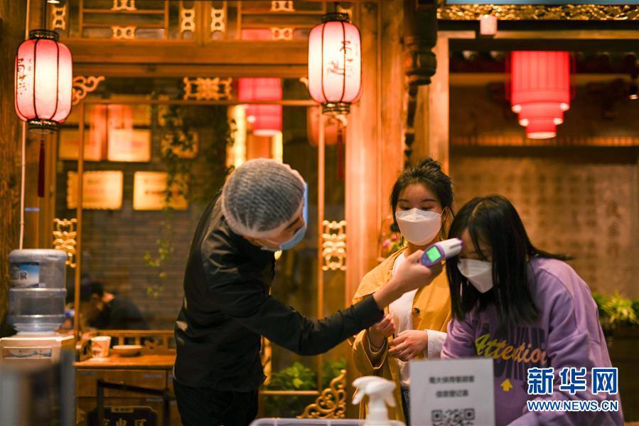 3月21日,在四川省成都市的一家火鍋店門口,顧客在登記信息,接受體溫檢測。近日,在做好新冠肺炎疫情防控措施的基礎(chǔ)上,四川省成都市的火鍋店逐漸恢復(fù)營業(yè)。新華社記者唐文豪攝