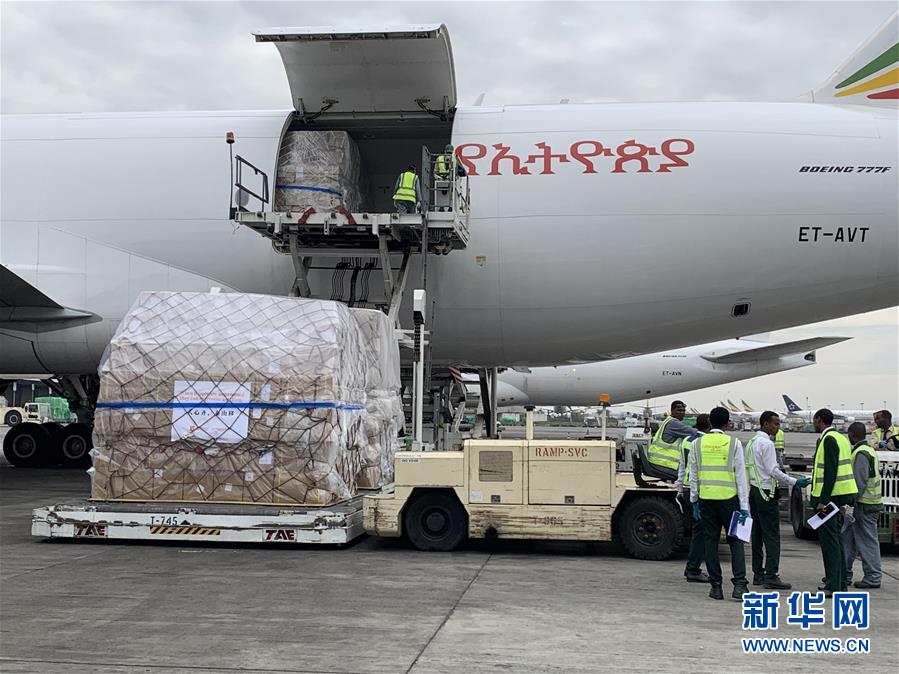 3月22日,在埃塞俄比亞首都亞的斯亞貝巴國際機(jī)場,工作人員將中國援助的抗疫物資運下飛機(jī)。歷時10小時飛行,滿載著來自中國抗疫物資的埃航貨運包機(jī)22日上午抵達(dá)埃塞俄比亞首都亞的斯亞貝巴的國際機(jī)場,這是馬云公益基金會和阿里巴巴公益基金會捐贈非洲的部分醫(yī)療物資,用于支援非洲54國抗擊疫情。新華社記者王守寶攝