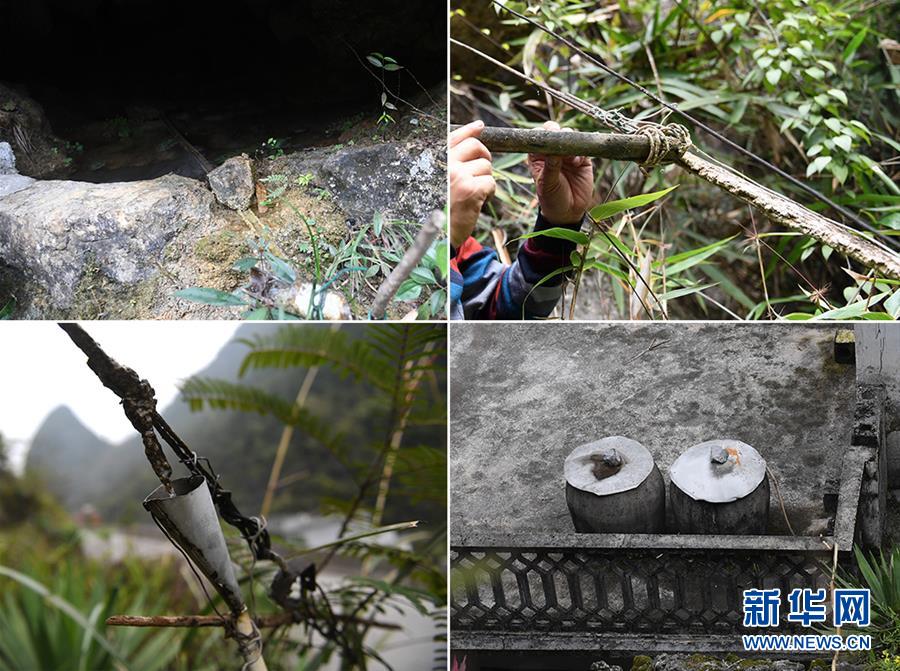 這張拼版圖片顯示廣西都安瑤族自治縣澄江鎮(zhèn)自成村加倫屯村民黃景飛獨(dú)創(chuàng)的“鐵線引水”法(2018年3月16日攝)。左上圖為竹枧將山泉水從山洞引出;右上圖為竹枧將山泉水引到鐵線上;左下圖為一個特制的漏斗將水接入膠管里;右下圖為膠管將山泉水送到水缸里。廣西有近一半貧困人口生活在石漠化地區(qū),涉及數(shù)十個縣區(qū)。這里也是廣西飲水保障程度最低的地區(qū),解決貧困人口飲水問題是廣西脫貧攻堅戰(zhàn)“硬仗中的硬仗”。“十三五”以來,廣西加快實施農(nóng)村飲水安全鞏固提升工程。因地制宜,采取新建、擴(kuò)建及管網(wǎng)延伸等多種措施,補(bǔ)齊貧困地區(qū)水利薄弱短板,進(jìn)一步提升石漠化地區(qū)群眾飲水安全保障水平,助推脫貧攻堅。新華社記者陸波岸攝