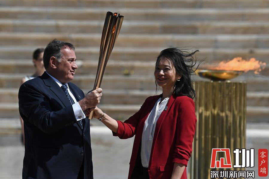 3月19日,日本代表團(tuán)成員井本直步子(右)從希臘奧委會(huì)主席斯皮羅斯·卡普拉洛斯手中接過東京奧運(yùn)會(huì)圣火火炬。