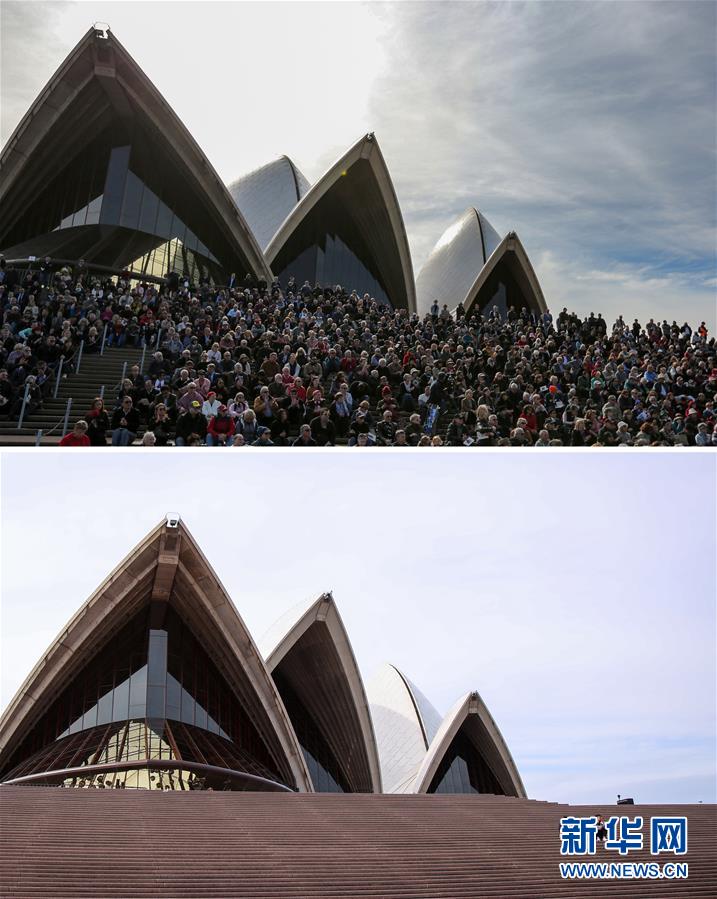 拼版照片顯示:(上)2019年6月14日,大量市民坐在澳大利亞悉尼歌劇院前的臺階上。(下)2020年3月24日,澳大利亞悉尼歌劇院前的臺階上空空蕩蕩。澳大利亞從當?shù)貢r間3月23日中午起,關(guān)閉影院、室內(nèi)體育館、健身房等文體娛樂場所,飯店和咖啡館只允許外賣業(yè)務(wù)。 新華社記者 白雪飛 攝