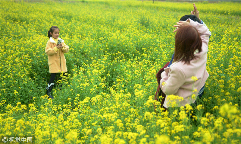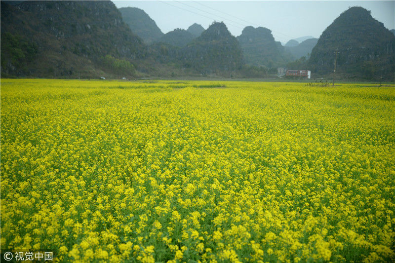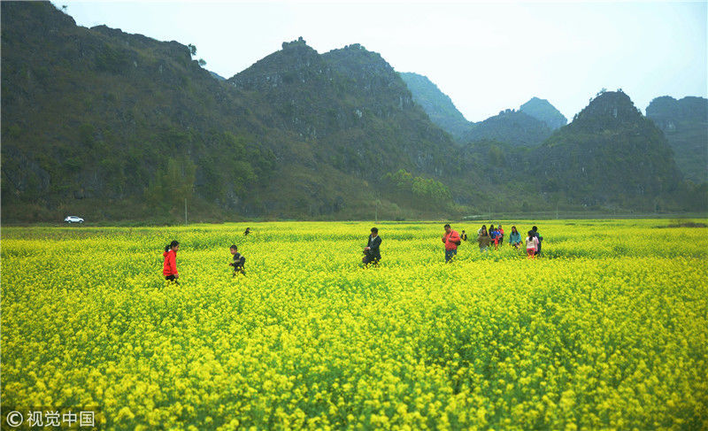 2019年2月5日,春節(jié)期間,廣西來(lái)賓市忻城縣萬(wàn)余畝油菜花競(jìng)相綻放,吸引眾多游客前來(lái)賞花游玩,感受春天的氣息。近年來(lái),廣西忻城縣大力實(shí)施鄉(xiāng)村振興戰(zhàn)略,注重發(fā)展鄉(xiāng)村旅游產(chǎn)業(yè),把鄉(xiāng)村旅游與美麗鄉(xiāng)村、脫貧攻堅(jiān)緊密結(jié)合起來(lái),輻射帶動(dòng)當(dāng)?shù)刎毨裘撠氈赂弧7B光/視覺中國(guó)