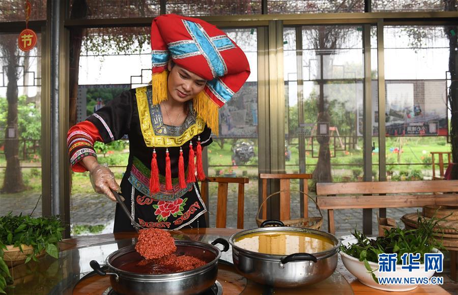 3月25日,在廣西上林縣巷賢鎮(zhèn),一名壯族女子在查看糯米浸泡染色情況。新華社記者陸波岸攝
