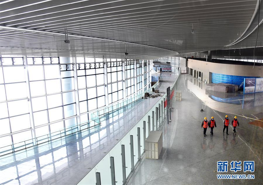 3月25日,幾名工人從建設(shè)中的青島膠東國(guó)際機(jī)場(chǎng)航站樓出發(fā)大廳走過(guò)。新華社記者李紫恒攝