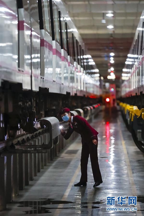 3月28日,武漢地鐵運營有限公司司機(jī)吳亞在常青車輛段檢查車輛情況。新華社記者沈伯韓攝