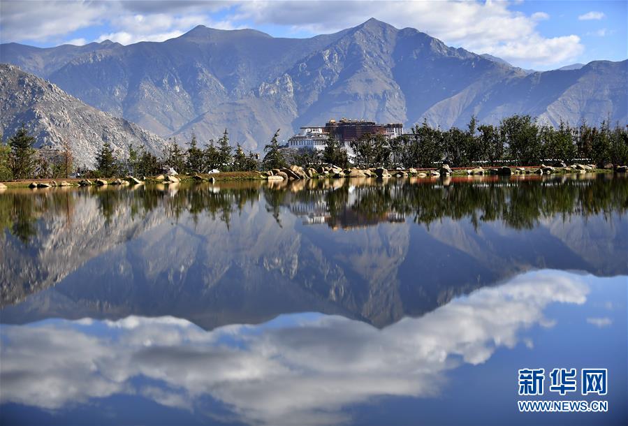 藍天白云和綠水之間的布達拉宮(6月5日攝)。新華社記者覺果攝