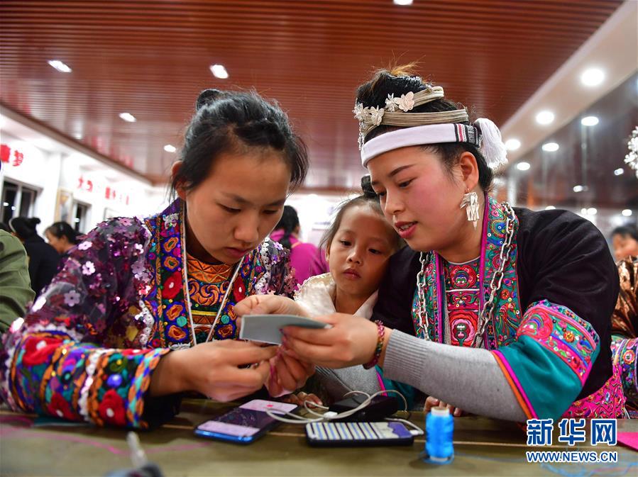 村民在廣西融水苗族自治縣易地扶貧安置點苗家小鎮(zhèn)“婦女之家巾幗扶貧車間”學習刺繡(2019年11月18日攝)。新華社記者黃孝邦攝