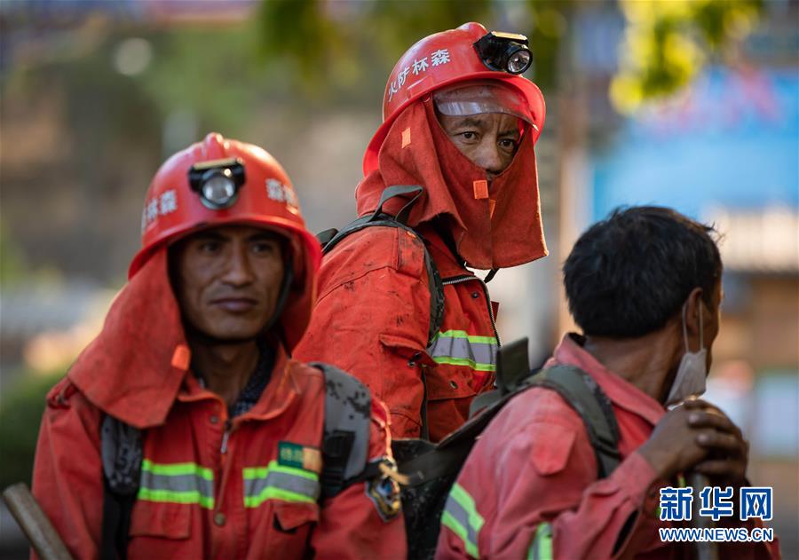 3月31日,幾名剛從火災(zāi)現(xiàn)場(chǎng)撤下來(lái)的撲火隊(duì)員在休整。新華社記者江宏景攝