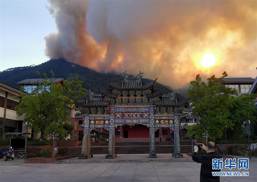 這是3月31日在四川省西昌市邛海畔拍攝的瀘山火場(chǎng)畫(huà)面。新華社記者惠小勇攝