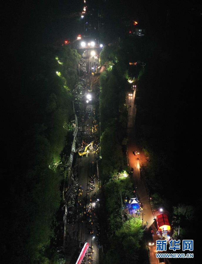 3月30日晚,工程機(jī)械在京廣鐵路郴州段脫軌事故現(xiàn)場作業(yè)(無人機(jī)照片)。新華社記者李尕?cái)z