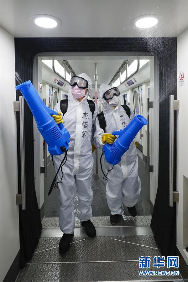 3月23日,在武漢地鐵常青車輛段,保潔人員在消毒。新華社記者肖藝九攝