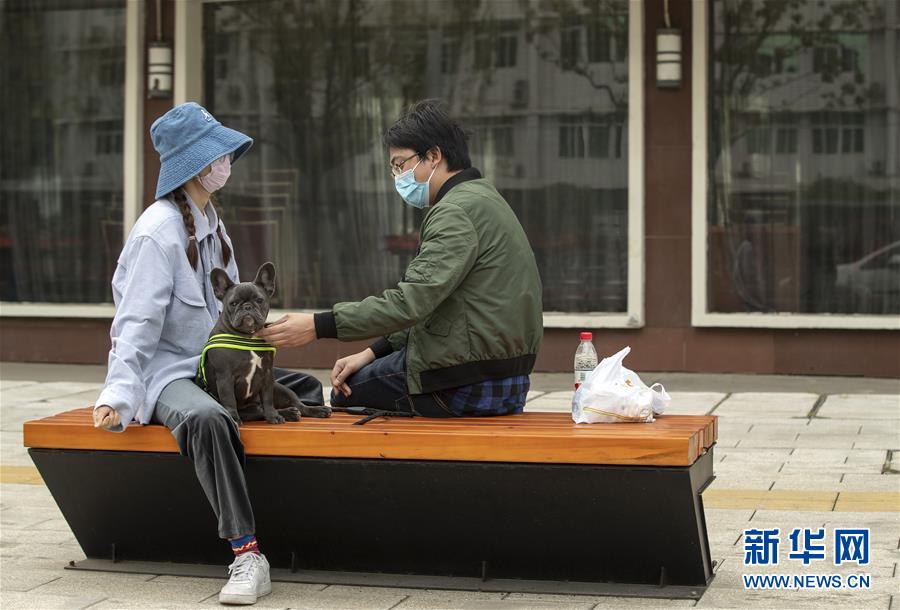 4月1日,兩人在路邊聊天逗狗。新華社記者費(fèi)茂華攝