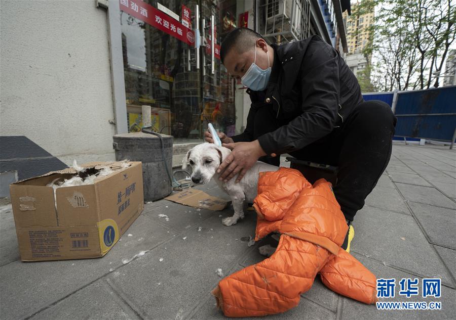 4月1日,一位市民在中山大道路邊給寵物剃毛,準(zhǔn)備迎接夏天。新華社記者費(fèi)茂華攝