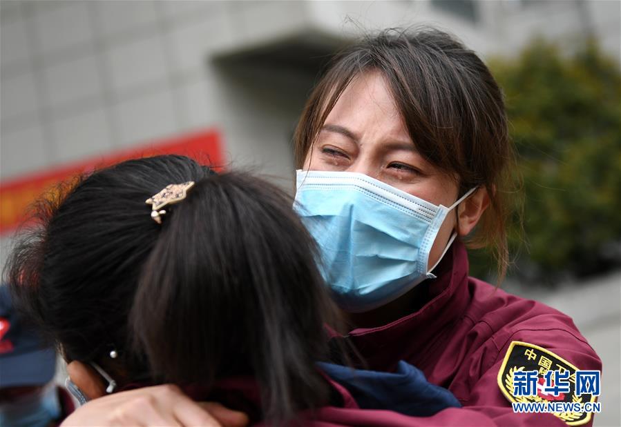 4月3日,來(lái)自陜西省榆林市第一醫(yī)院的醫(yī)療隊(duì)隊(duì)員王晶晶(右)與“戰(zhàn)友”擁抱時(shí)落淚。 當(dāng)日,陜西省第一批援鄂醫(yī)療隊(duì)137名隊(duì)員在陜西省工人療養(yǎng)院結(jié)束了為期兩周的隔離休養(yǎng)。醫(yī)療隊(duì)員與“戰(zhàn)友”深情作別后,陸續(xù)踏上歸途。 新華社記者 李一博 攝