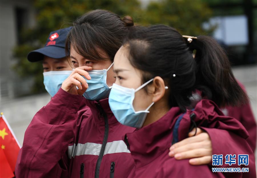 4月3日,來(lái)自西安交通大學(xué)第一附屬醫(yī)院的醫(yī)療隊(duì)隊(duì)員王沙沙(前)在送別“戰(zhàn)友”后落淚。 當(dāng)日,陜西省第一批援鄂醫(yī)療隊(duì)137名隊(duì)員在陜西省工人療養(yǎng)院結(jié)束了為期兩周的隔離休養(yǎng)。醫(yī)療隊(duì)員與“戰(zhàn)友”深情作別后,陸續(xù)踏上歸途。 新華社記者 李一博 攝