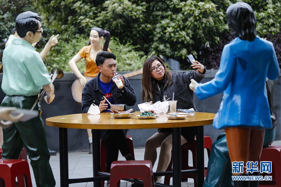 4月5日,市民在武漢市吉慶街的“大排檔”雕塑旁用餐。新華社記者沈伯韓攝