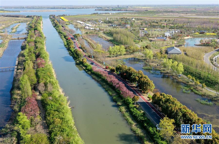 這是4月6日拍攝的白馬湖風光(無人機全景照片)。近日,江蘇省淮安市白馬湖畔春花綻放,景色怡人。白馬湖地處淮河流域下游,東貫大運河,西倚洪澤湖,南北分別銜接淮河入江水道和入海水道,湖泊水域面積113平方公里,是全國15個生態(tài)良好重點保護湖泊之一。 新華社記者 楊磊 攝