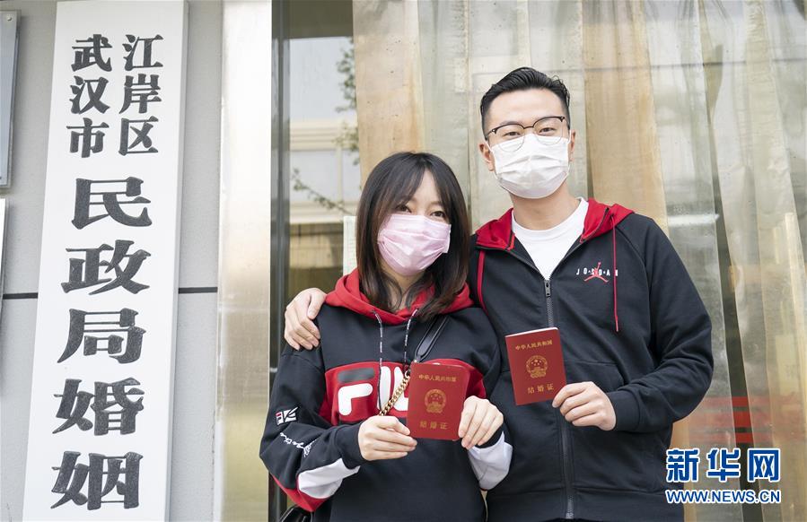 4月7日,在武漢市江岸區(qū)民政局婚姻登記處,陳先生與張女士展示結(jié)婚證。4月3日起,武漢市婚姻登記機構(gòu)陸續(xù)恢復辦理婚姻登記業(yè)務?;橐霎斒氯诵璩志G色健康碼預約登記,分批分時辦理。 新華社記者才揚攝